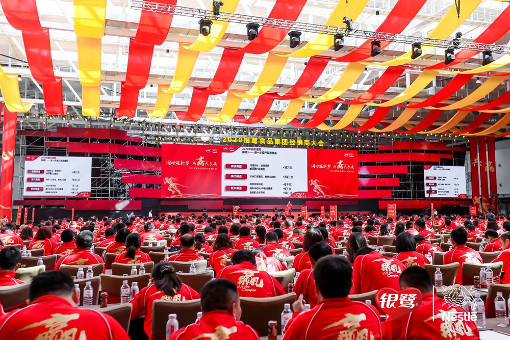 大會正式開始前,經銷商們紛紛抵達現場。不同于往年,眾多新穎時尚的產品堆頭陳列:與頤和園IP合作的臻養粥古風禮盒,雀巢咖啡世界咖啡系列等等新品,吸引經銷商們和業務團隊競相拍照、品嘗產品,現場氛圍火爆。本次大會最引人注目的是火紅色經銷商服上的“贏”字,展現了此次大會的信心與決心。